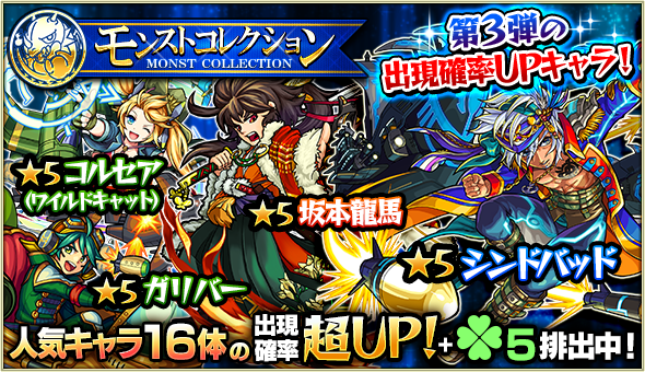 「モンコレ」常連となりつつある坂本龍馬やロミオ、アーサーなどに加え、獣神化が可能となったハンターキング、「爆絶」クエストの攻略に適しているシンドバッドなど、注目すべきモンスターが勢ぞろいです!
