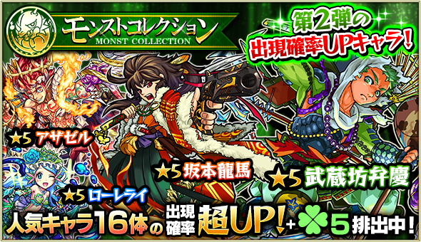 「モンコレ」常連となっている坂本龍馬や茨木童子、桜に加え、「覇者の塔」攻略に役立つアザゼル、獣神化により高い汎用性と強力な友情コンボを手に入れたロイゼも参戦。