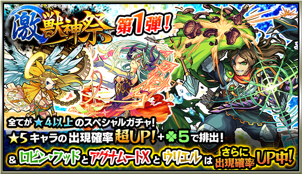 ガチャ「激・獣神祭」は、神クラス★5キャラクターの出現確率が超UP&「ラック5」で排出され、金卵(★4以上)が確定のスペシャルなガチャです!激・獣神祭限定キャラクターの「ロビン・フッド」「妲己」「天草四郎」「ウリエル」「アリス」「アグナムート」「アグナムートX」も排出されます。
