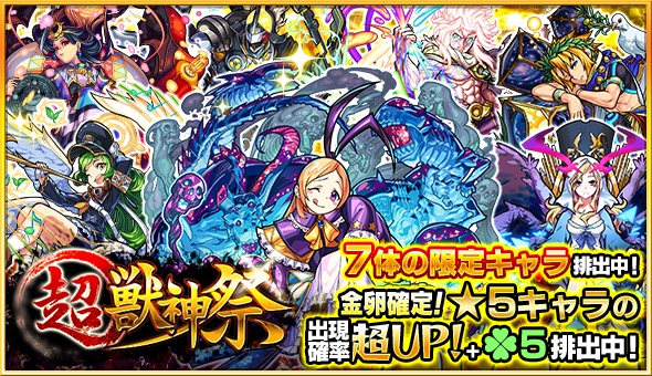 1月30日(月)よりガチャ「超・獣神祭」開催!神クラス★5キャラの出現確率が超UP&「ラック5」で排出され、金卵(★4以上)が確定のスペシャルなガチャです!また、超・獣神祭限定キャラの「パンドラ」「ノア」「神威」「ガブリエル」「卑弥呼」「ルシファー」「ストライク」も排出されます。