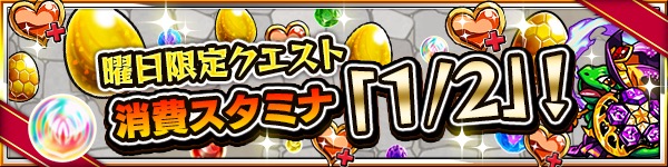 期間中、曜日限定クエスト(亀)(進化素材)(獣神竜)の消費スタミナが「1/2」になります。
