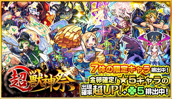 4月29日(土・祝)よりガチャ「超・獣神祭」開催!神クラス★5キャラの出現確率が超UP&「ラック5」で排出され、金卵(★4以上)が確定のスペシャルなガチャです。