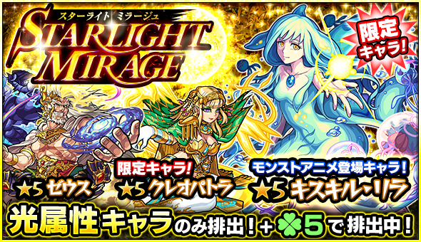 『モンスターストライク(モンスト)』にて9月24日(土)より、ガチャ「STARLIGHT MIRAGE」が開催!「キスキル・リラ」「ゼウス」「アーサー」「劉備」などを含む光属性キャラクターのみが「ラック5」で排出される、スペシャルなガチャです。