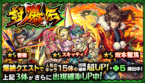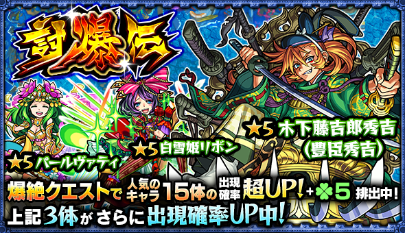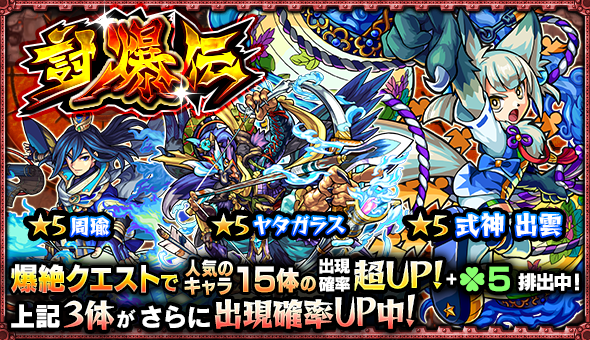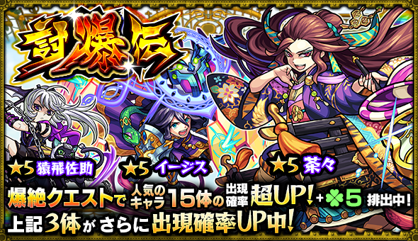 『モンスターストライク(モンスト)』にて10月5日(水)12:00より、ガチャ「討爆伝」が開催!"爆絶"クエストで人気のキャラクター15体が大集結した、スペシャルなガチャです。