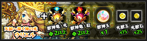 「懺悔の智天使 ウリエル」「破壊の熾天使 ウリエル」いずれか+獣神竜・光(ラック3)+獣神竜・紅(ラック2)+獣神玉(2)+光獣玉(30)+光獣石(50)