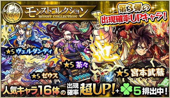 『モンスターストライク(モンスト)』にて11月25日(金)より、ガチャ「モンストコレクション」が開催中!「服部半蔵」「坂本龍馬」「サタン」「レンブラント」など、人気キャラクター16体が大集結したスペシャルなガチャです。開催期間中、16体の対象キャラクターは通常時よりも出現確率がUP&「ラック5」で排出されます。
