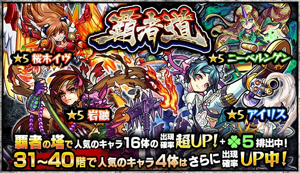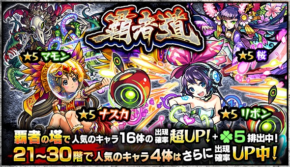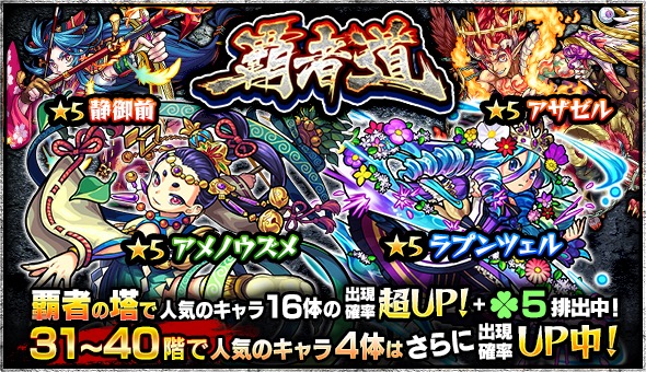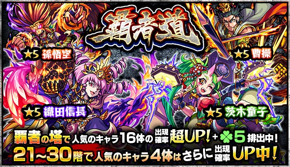 『モンスターストライク(モンスト)』にて2月7日(火)より、ガチャ「覇者道」が開催されます。特別イベントクエスト「覇者の塔」で人気のキャラクター16体が大集結した、スペシャルなガチャです。