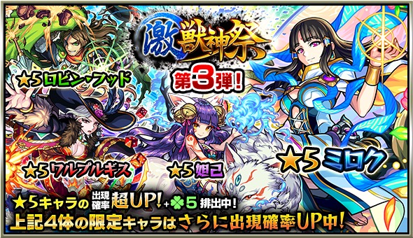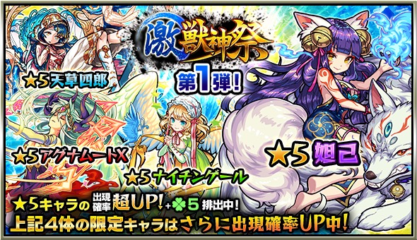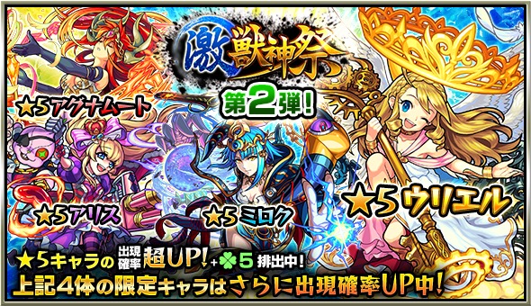 激・獣神祭限定キャラクターの「ミロク」「ワルプルギス」「ナイチンゲール」「ロビン・フッド」「妲己」「天草四郎」「ウリエル」「アリス」「アグナムート」「アグナムートX」も排出されます。