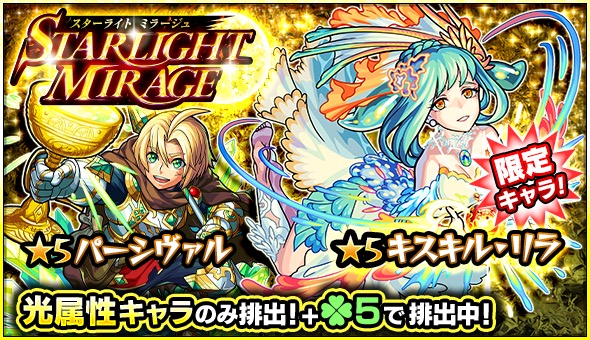 ガチャ「STARLIGHT MIRAGE」は、「キスキル・リラ」「クレオパトラ」「パーシヴァル」などを含む光属性キャラクターのみが「ラック5」で排出されます。