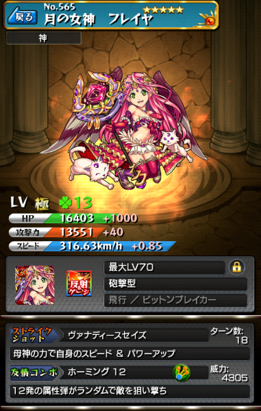 進化後の☆5「月の女神 フレイヤ」になるとゲージショットが追加され、成功するとアンチダメージウォールが付きます。更に先日のアップデートにて飛行アビリティも追加されたので、多彩な能力をもったモンスターになります。