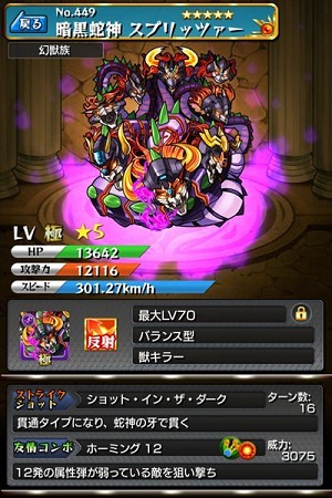 ちなみに、こちらが神化後の☆5「暗黒蛇神 スプリッツァー」。ヴィジュアルがカッコ良くなりました!ステータスもバランス良く育ってくれているし、ホーミングの威力も上がっていますね。ストライクショットが変わり、貫通型に変化する技になっています。使いやすいかは個人差にもよりますが、必要ターン数も少ないので良いのではないでしょうか。