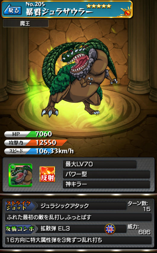 「ジュラザウラー」は反射タイプのパワー型、アビリティは神キラー。初期のステータスは以下のとおりです。