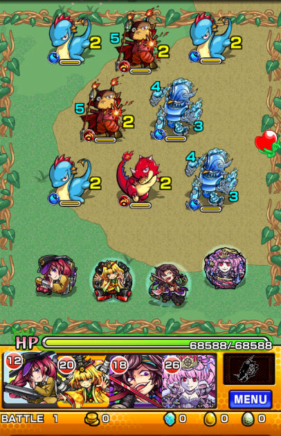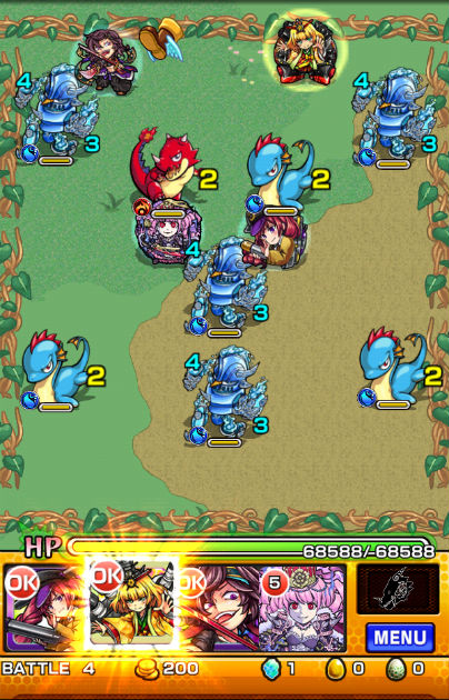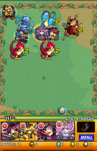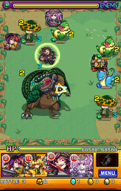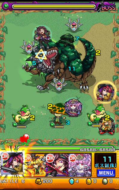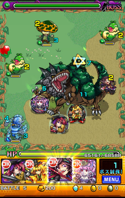 また、クエストの特徴としてギミックがラストの「ジュラザウラー」を覆うシールドしか無いので、比較的自由に編成する事が可能です。道中の敵に水属性が多いので、火属性で固めてしまうと少々厳しい面もあるかもしれませんが、そこまで気にしなくても問題ないです。安定して組むならば、木属性モンスターも混ぜると有利かと思います。降臨モンスターでレア度が高くなってしまいますが、木属性ならば魔王キラー持ちの☆6「フルール」、☆6「土星魔機神サターン」、もしゲット済ならば「絶対君主ジュラザウラー」も戦力になります。