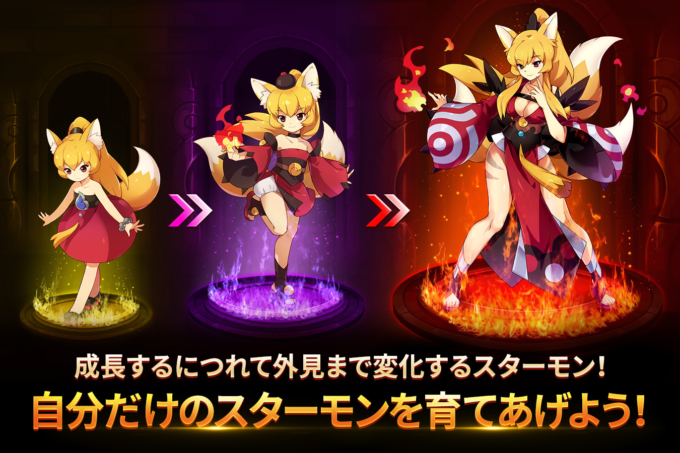 各スターモンには、5つの戦闘タイプ(タンク・バランス・回復・攻撃・守備)と5つの属性(火・水・木・光・闇)が存在。各タイプのスターモンを4つ組み合わせ、パーティーをつくり、各ダンジョンやプレイヤーバトルを進めていきます。