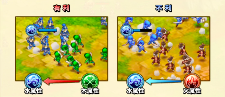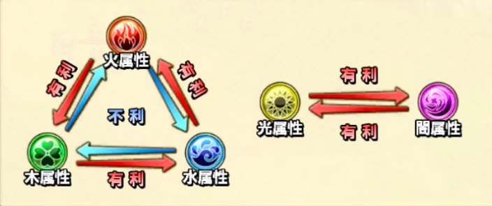 上記の画像を見てもらえば分かるように「火、水、木、光、闇」の5種類あり、もちろん相性もあります。