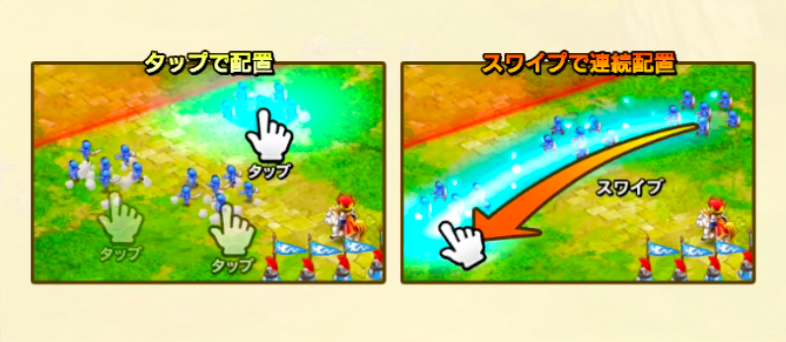 バトル画面では、マップ上をタッチ・スワイプすると兵士が配置されます。