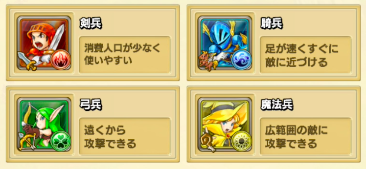 例えば、敵の兵種が「弓兵」なら、スピードのある「騎兵」が役に立ちます。
