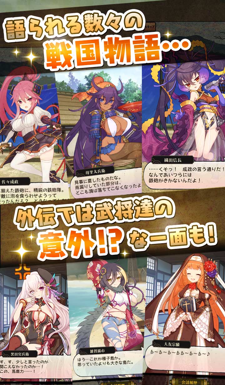 メインとなる「物語」では、数々の戦国物語を読み進めながら、合戦バトルを攻略!