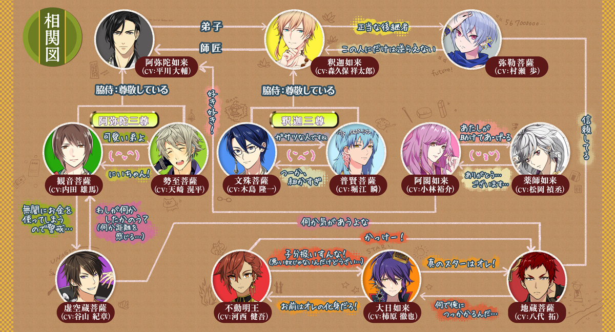 公式サイトには各仏たちの相関図も登場!それぞれの関係性やグループが分かりやすくなっているので、始める前にチェックしておくと良いかも知れません。