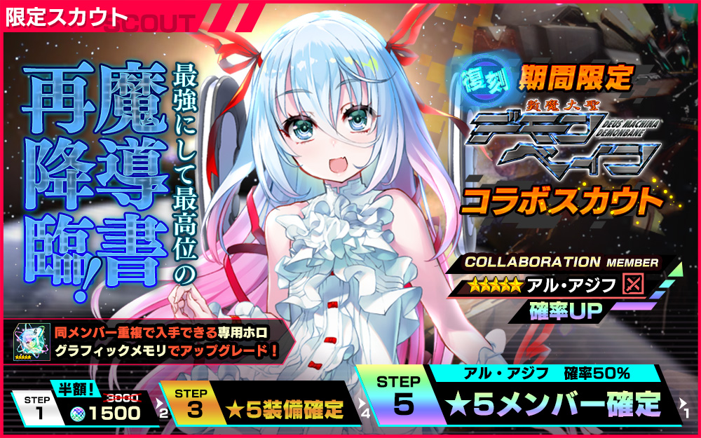 本スカウトでは、★5「アル・アジフ」の確率がアップしているほか、STEP5で★5メンバーが確定し、50%の確率で★5「アル・アジフ」が排出されます。