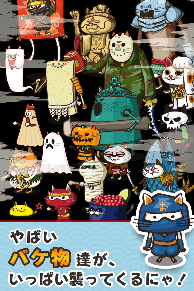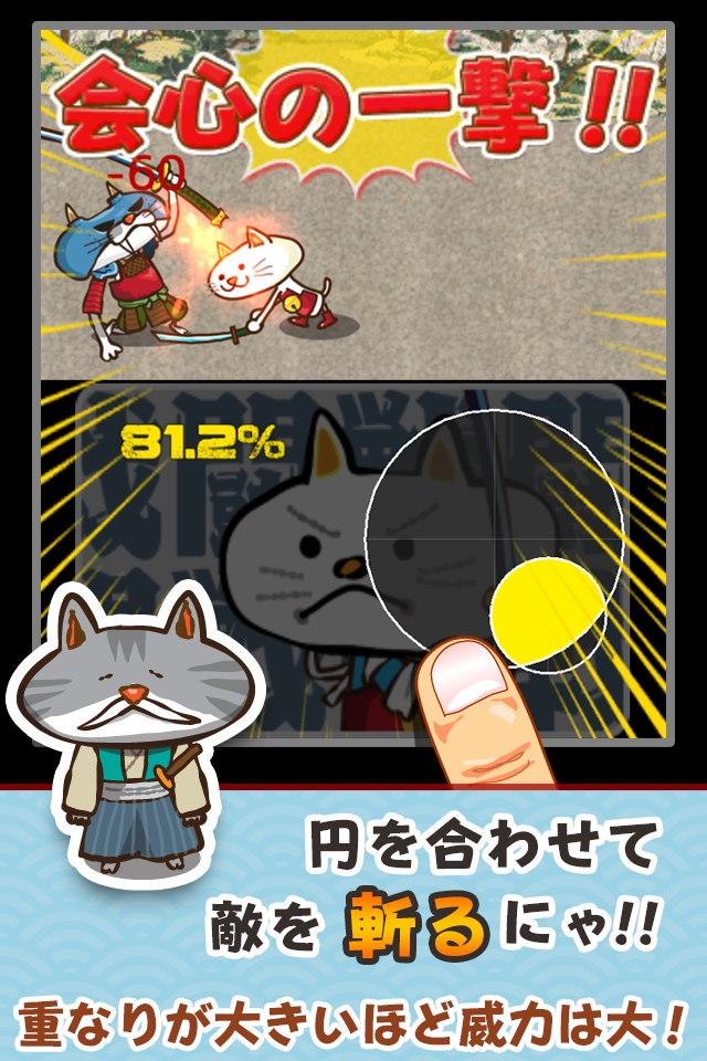 本ゲームは、にゃんこ将軍しろ宗が敵を倒しながら京を目指す、ステージクリア型のチャンバラアクションRPGです。二つの円を重ねて、敵のバケ物にダメージを与えます。倒したバケ物は仲間になってくれることもあり、仲間になったバケ物を助っ人として使用することでステージ攻略を優位に進めることが可能できます。