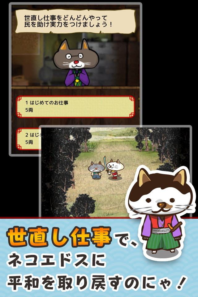 移動式エド城を従え、目指すは、にゃん京。にゃん京にたどり着くには、迫り来る敵を退けつつ、五十三次と呼ばれる53の宿場を越えていかねばなりません。それぞれの宿場の口入れ屋から頼まれた世直し仕事を解決しつつ(同時に旅資金も稼ぎつつ)、仲間を増やしながら、しろ宗は旅を続けるのでした。