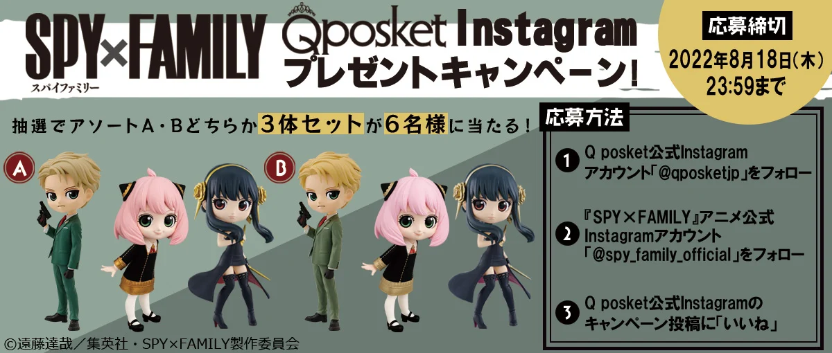 Q posket公式Instagramアカウント(@qposketjp)と、「SPY×FAMILY」アニメ公式Instagramアカウント(@spy_family_official)をフォローし、対象のキャンペーン投稿に「いいね」をすることで応募可能です。