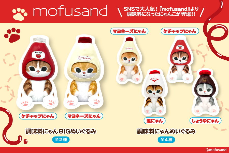 ケチャップ、マヨネーズ、塩、しょうゆの調味料容器の着ぐるみを着て調味料になったにゃんこ「調味料にゃん」のBIGぬいぐるみ全2種とぬいぐるみ全4種がラインナップ。SNSで大人気の「mofusand」プライズをお見逃しなく!
