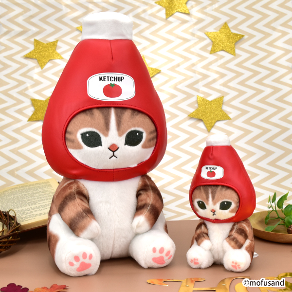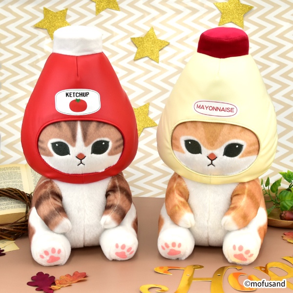 ぢゅのさんが描く「mofusand」から、ケチャップにゃん、マヨネーズにゃん、塩にゃん、しょうゆにゃんのぬいぐるみが登場します。