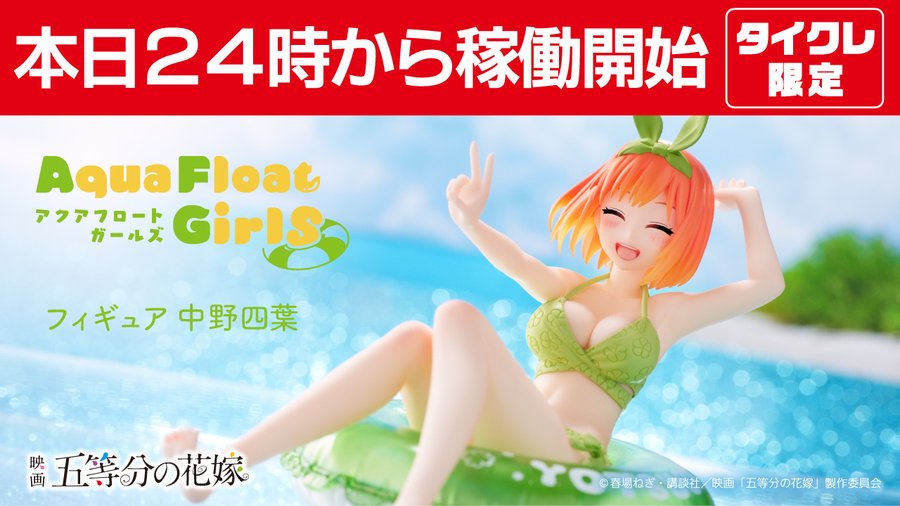 🍀本日24時から稼働開始🍀映画 #五等分の花嫁 Aqua Float Girlsフィギュア 中野四葉のタイクレ限定版が登場!四葉には天真爛漫な笑顔がとっても似合う🌈眺めていると一緒にはしゃぎたくなりますね🌊▼ #タイクレ をプレイhttps://t.co/FO4qGUKCOP pic.twitter.com/8BbdSwBEY7— タイトーオンラインクレーン (@Taito_Olcrane) April 21, 2023