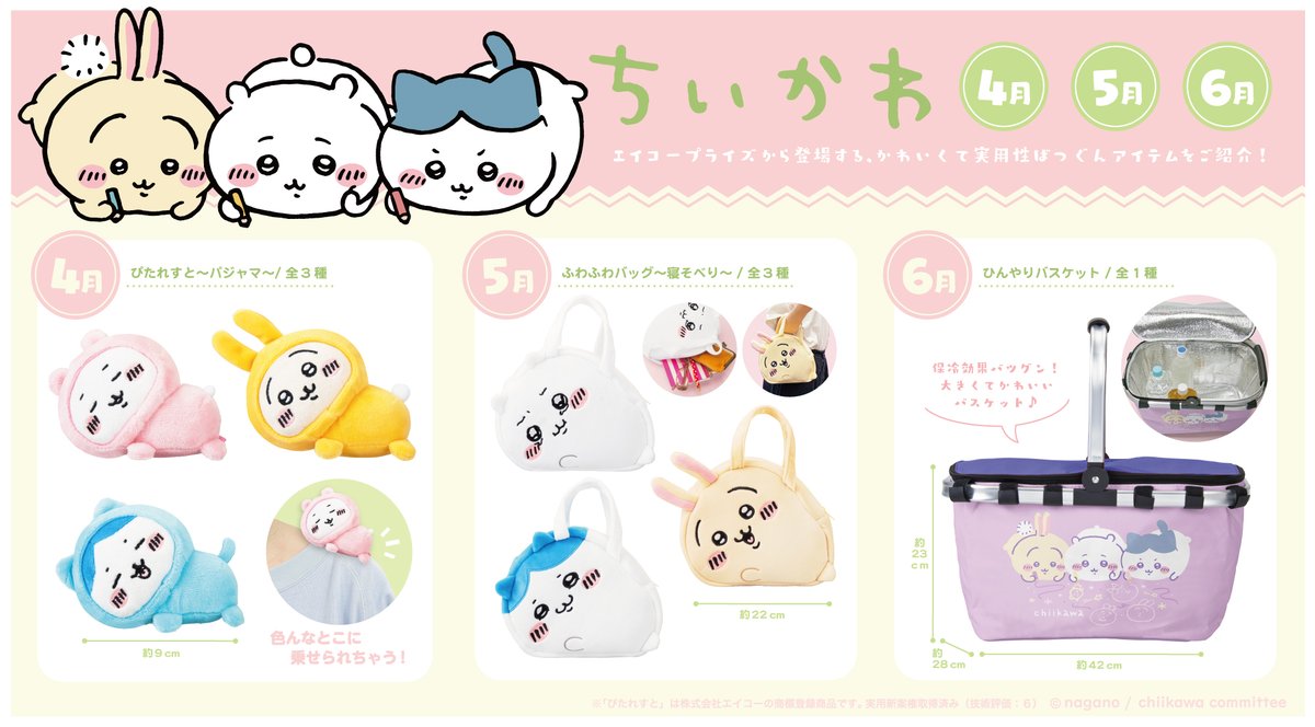 🌿🌱🌼🌿🌱🌼🌿🌱🌼✨2023年4.5.6月登場✨ちいかわグッズをご紹介!🌿🌱🌼🌿🌱🌼🌿🌱🌼4月ぴたれすと〜パジャマ〜5月ふわふわバッグ〜寝そベり〜6月ひんやりバスケット▼2023年4月からアミューズメント施設に 順次登場!▼取扱店舗など詳細は発売月に 掲載予定。#ちいかわ pic.twitter.com/Uhd1XXhe2w— エイコープライズ公式アカウント (@Eikoh_AM) March 28, 2023