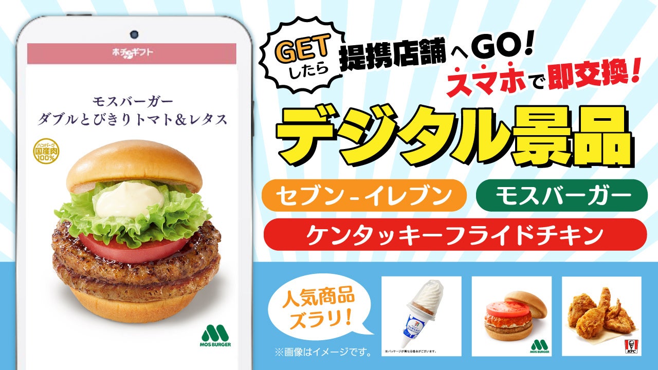 『デジタル景品』は、セブン-イレブン、モスバーガー、ケンタッキーフライドチキンの人気商品と交換できる景品です。全国の提携店舗で『デジタル景品』獲得後に表示されるコードを提示すると、該当商品と交換することができます。