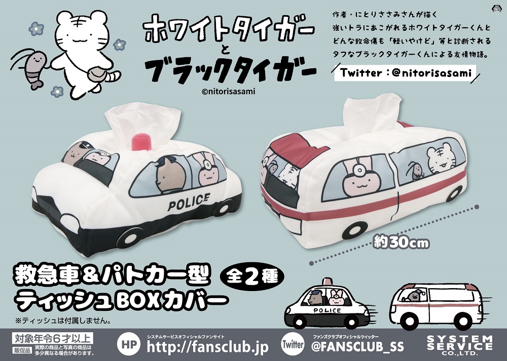 『ホワイトタイガーとブラックタイガー』にて、「救急車」と「パトカー」のティッシュBOXカバーがプライズ景品として登場!