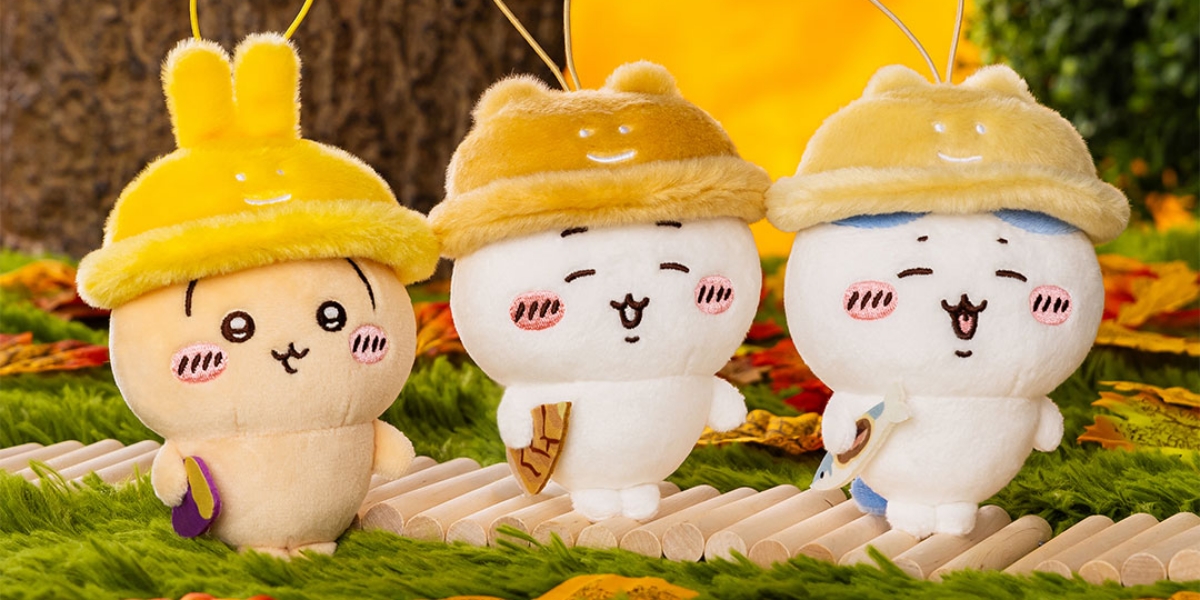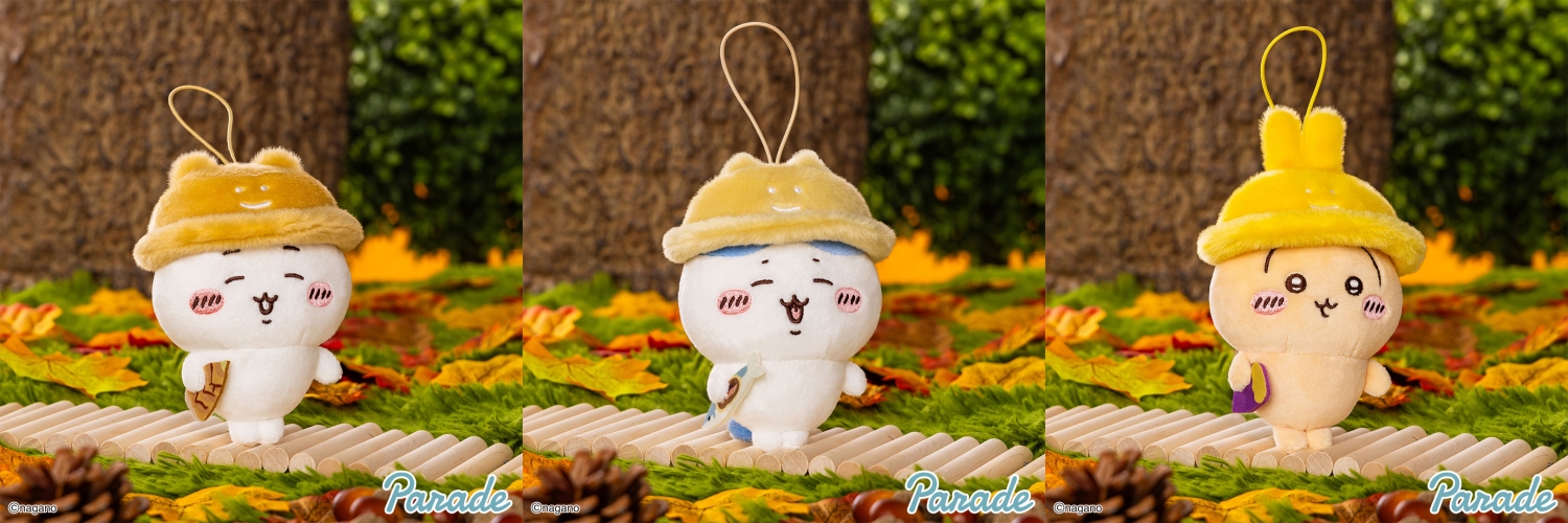 秋の味覚を楽しんで笑顔を浮かべる、ちいかわ・ハチワレ・うさぎのマスコットをオンクレでお見逃しなく。