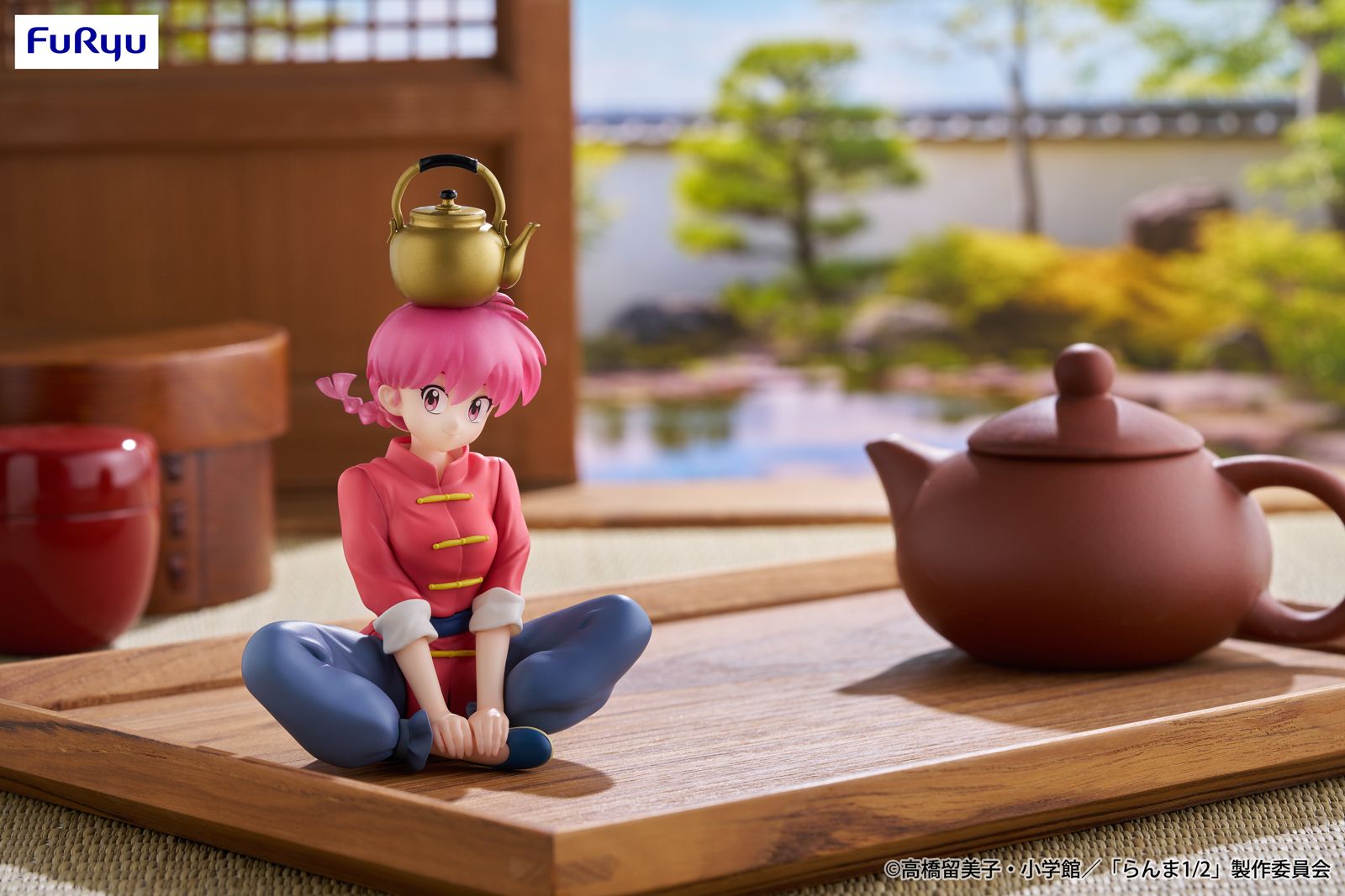 水を被って女性になったらんまが、頭にやかんを載せて胡坐をかいたポージングで立体化。