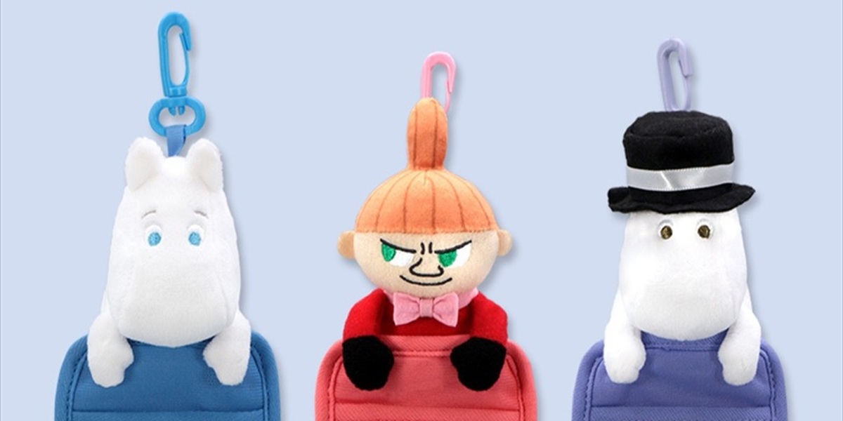 「ムーミントロール」「リトルミイ」「ムーミンパパ」のぬいぐるみのあしらった全3種がラインナップ。持ち運びに便利なワンタッチフック付きです。