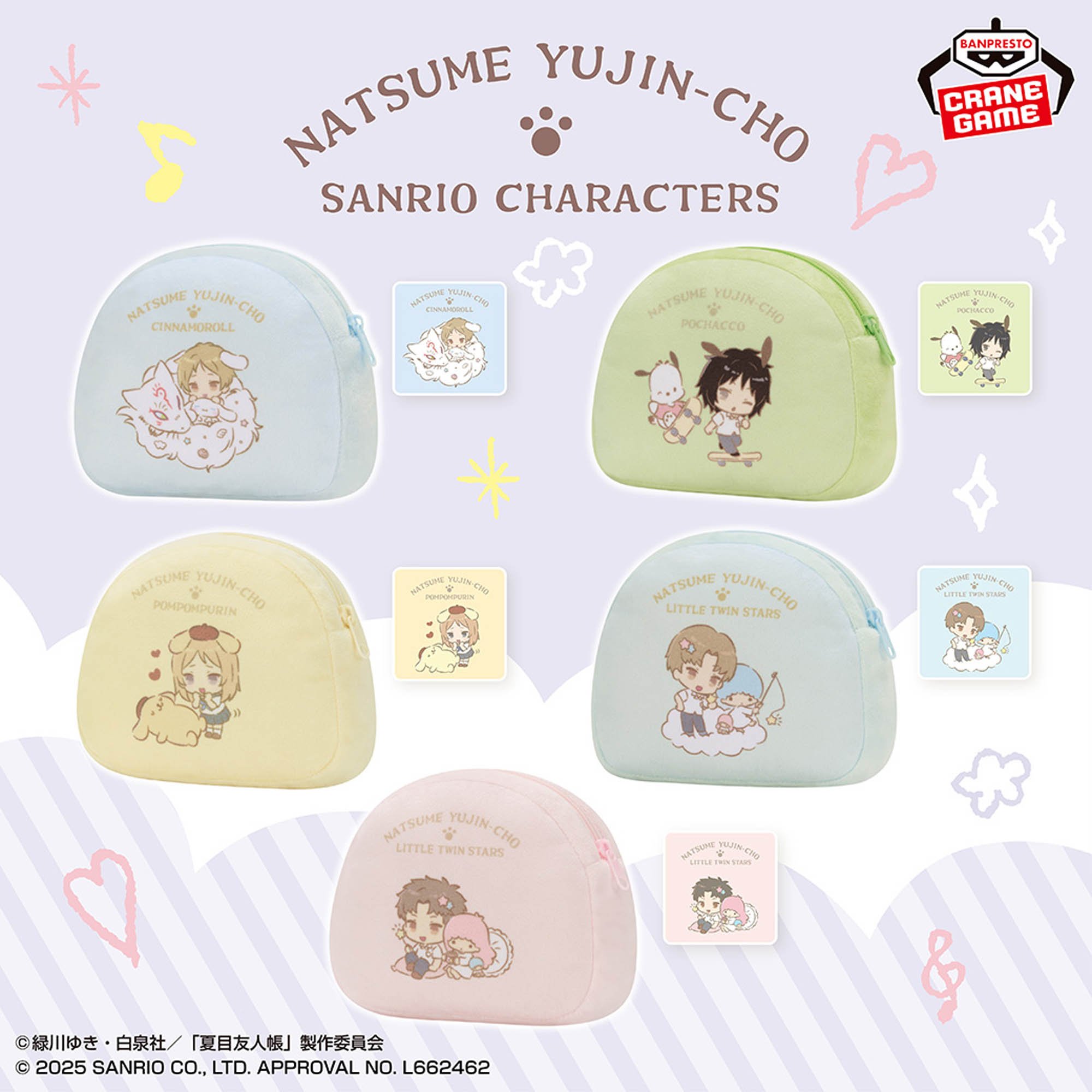 ふわふわポーチの第2弾に「夏目貴志×斑×シナモロール」「田沼要×ポチャッコ」「多軌透×ポムポムプリン」「西村悟×キキ」「北本篤史×ララ」の全5種がラインナップ。パステルカラーが魅力的です。