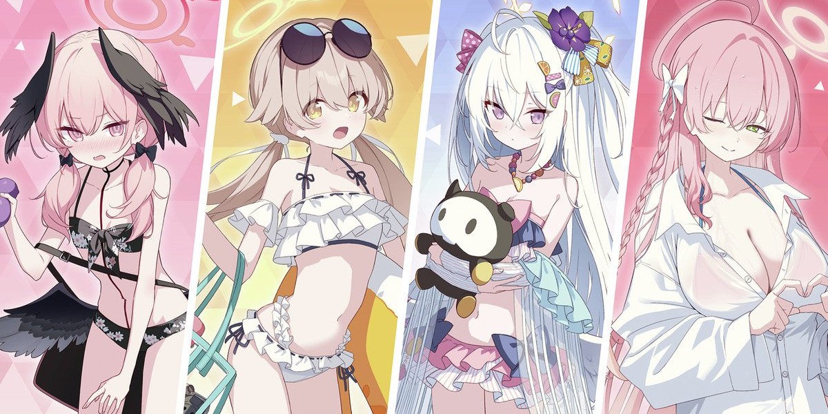 「阿慈谷ヒフミ」「白洲アズサ」「下江コハル」「浦和ハナコ」の全4種がラインナップ。水着姿の生徒たちが爽やかに描かれています。