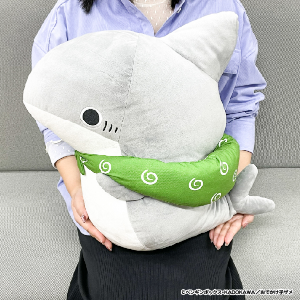 風呂敷姿の子ザメを全長約40cmの特大サイズで立体化。膝の上に乗せて抱っこしたり、隣に並んで座れるボリューム感となっています。