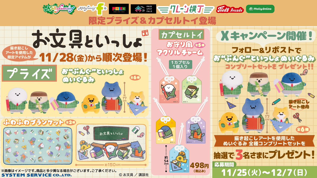 イオンファンタジーのオンラインクレーンゲーム「モーリーオンライン」および「モーリーファンタジー」「PALO」などのアミューズメント施設にて、本日2025年11月28日(金)より、『お文具といっしょ』の限定プライズとカプセルトイが登場しています。