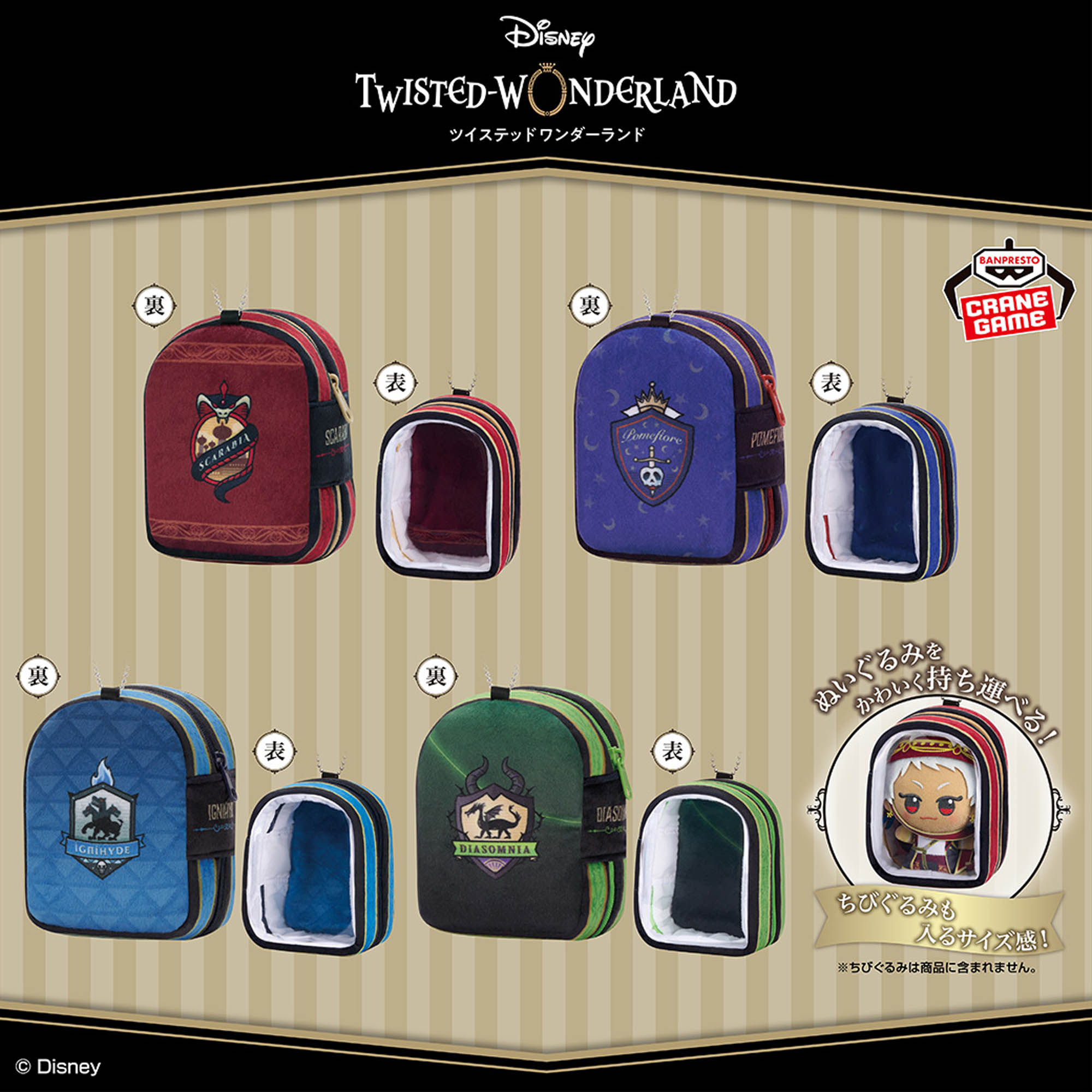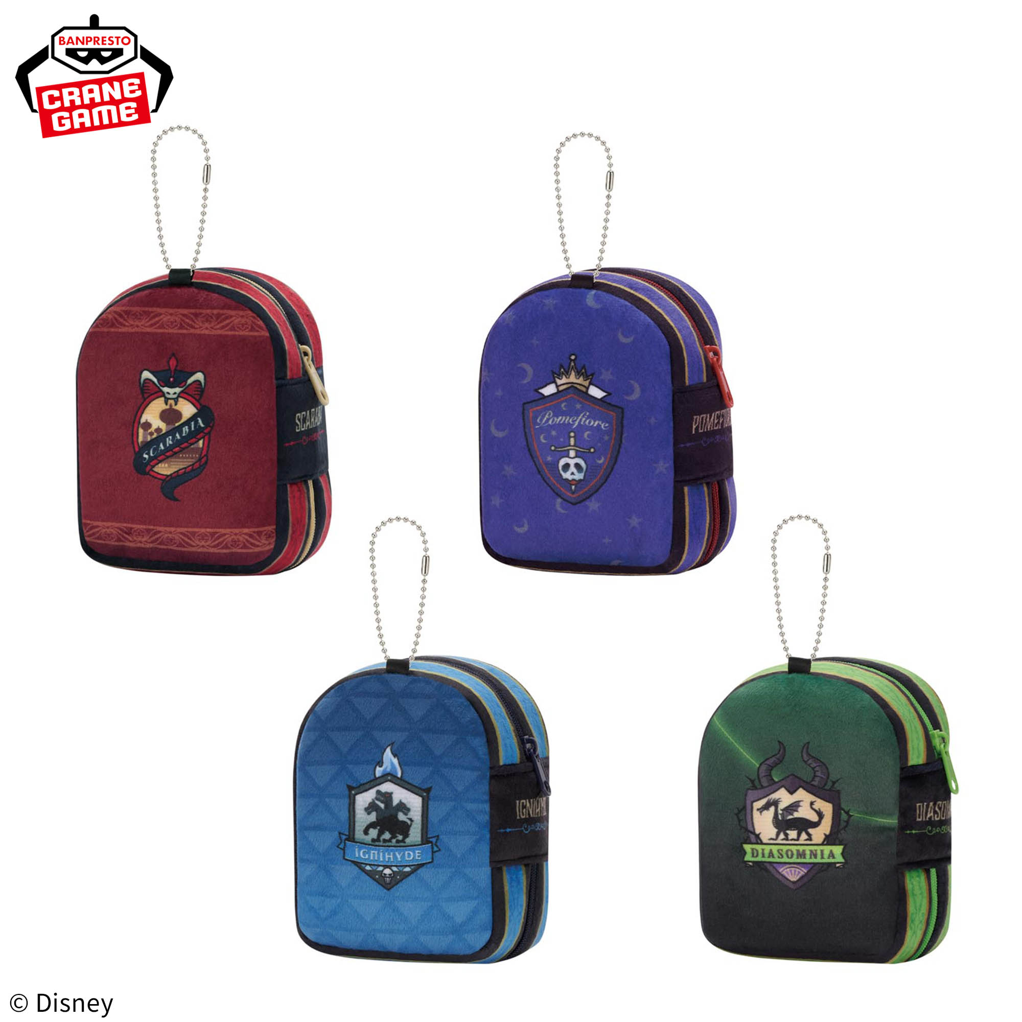 『ディズニーツイステッドワンダーランド』より、「スカラビア寮」「ポムフィオーレ寮」「イグニハイド寮」「ディアソムニア寮」のぬいぐるみポーチがプライズ景品としてオンクレに登場!