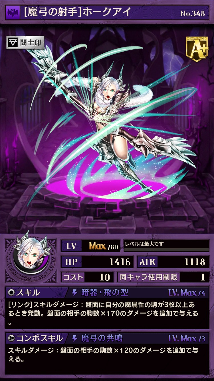 この「ホークアイ」のスキル「暗器・飛の型(あんき・ひのかた)」は、盤面に自分の魔属性の駒が3枚以上あるときに発動し、「盤面の相手の駒数×170(※)」のダメージを追加で与えることができます。これは、ターン開始時の盤面にある、同じ属性の駒の数に応じて発動する[リンク]スキルのひとつです。また、コンボスキルには、「盤面の自分の駒数×120(※)」のダメージを追加で与える「魔弓(まきゅう)の共鳴」をもっています。
