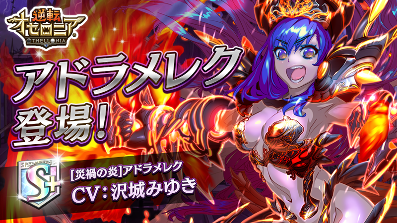 株式会社ディー・エヌ・エーが、スマートフォン向けに配信中のドラマチック逆転バトルゲーム『逆転オセロニア』では、3月1日(火)に、魔属性限定ガチャ「災禍の炎セット」に、魔属性激超レアSキャラ「アドラメレク(CV:沢城みゆき)」を含む、「ルサリィ(A)」「クルエル(A)」の3体が登場します。