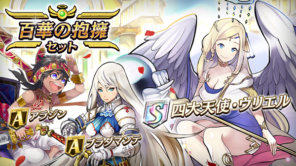 期間限定ガチャ「百華の抱擁セット」に、神属性激超レアSキャラ「四大天使・ウリエル(CV:野村真悠華)」を含む、「ブラダマンテ(A)」「アラジン(A)」の3体が登場します。