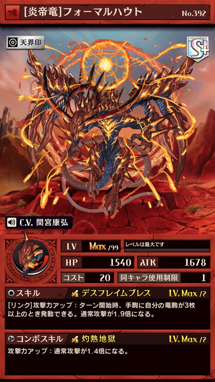 この「フォーマルハウト」は、スキルに[リンク]スキルの「デスフレイムブレス」、コンボスキルには「灼熱地獄(しゃくねつじごく)」をもっています。このスキルとコンボスキルは、どちらも攻撃力を上げる効果があります。
