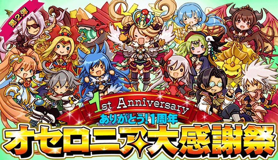 『逆転オセロニア』は、2017年1月19日(木)に、「1周年大感謝祭」第2弾を開始しました。第2弾では、「10+1回ガチャ」が無料で引ける「1周年記念カウントダウンガチャ」など、イベントやキャンペーンが多数開催されます。また、コレクションガチャ「逆転コレクション」に新しく激超レアSキャラを追加します。