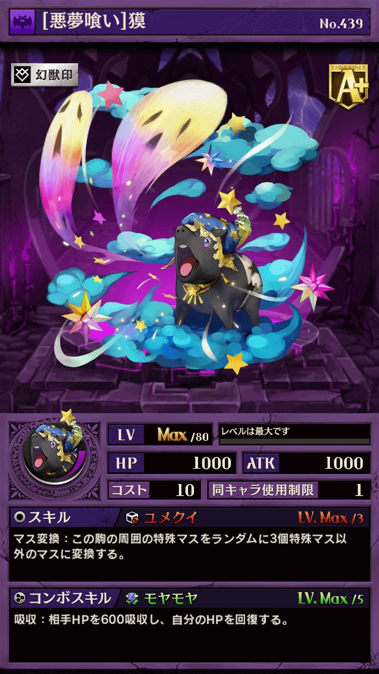 この「夢喰い獏」は、自分の周囲の特殊マスを消すスキル「ユメクイ」と、相手のHPを吸収して自分のHPを回復するコンボスキル「モヤモヤ」をもっています。なお、すべてのステージで「ラピスラズリ」や「詩人のランプ」などの進化アイテムを入手できる可能性があります。