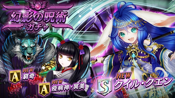 今回の「幻影の呪術(げんえいのじゅじゅつ)」で、プレミアムガチャに魔属性の激超レアSキャラ「クイル・クエン(CV:桜木アミサ)」「疫病神・冥美(やくびょうがみ・めいび)(A)」「窮奇(きゅうき)(A)」が追加されます。