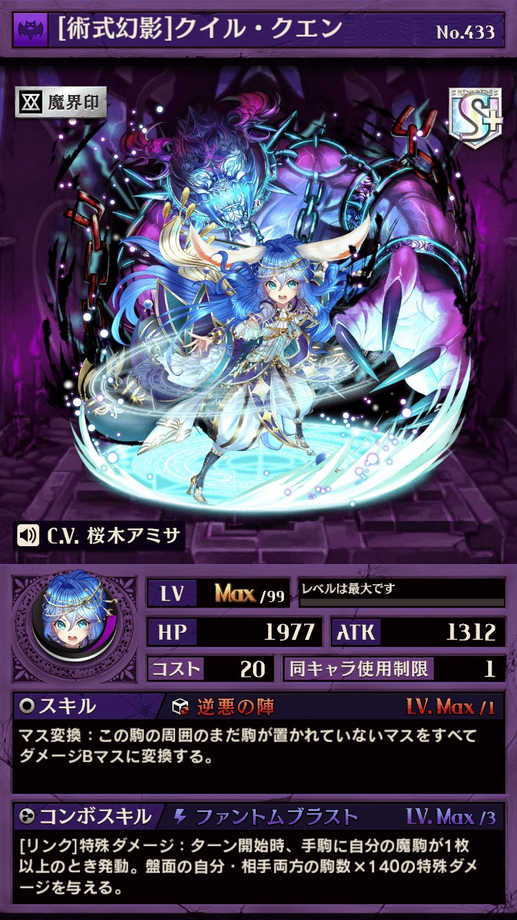 この「クイル・クエン」は、自分の周囲のまだ駒が置かれていないマスを変換するスキル「逆悪の陣(ぎゃくあくのじん)」と、コンボスキルには、盤面の自分と相手の駒数に応じた特殊ダメージを与える[リンク]スキルの「ファントムブラスト」をもっています。