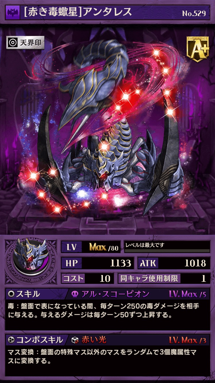 「決戦!アンタレス」は開始時から、スキルが発動している状態で盤面に配置されている相手のステージ専用キャラクター(駒)が登場するのが特徴です。イベントをクリアすると「アンタレス」を一定の確率で手に入れることができます。ただし、ステージ専用キャラクター(駒)は入手できません。この「アンタレス」は毒ダメージを与えるスキルと、マスを変換するコンボスキルをもっています。